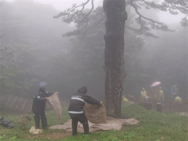 7月25日白天,受颱風“煙花”週邊影響,黃山風景區出現較強降水、大風天氣,最大風力9-10級。景區公安、綜治、交通、園林等一線管理部門和索道、酒店、票房、環衛等接待單位幹部員工堅守崗位,保護景區資源,維護旅遊秩序,服務來山遊客,積極做好颱風“煙花”防範各項工作。截至25日17:30,景區索道、遊道、交通暢通,旅遊秩序平穩,迎客松等古樹名木安全。
