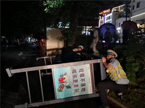交警夜間冒雨搬移被風吹倒的不銹鋼棚 郝義明 攝