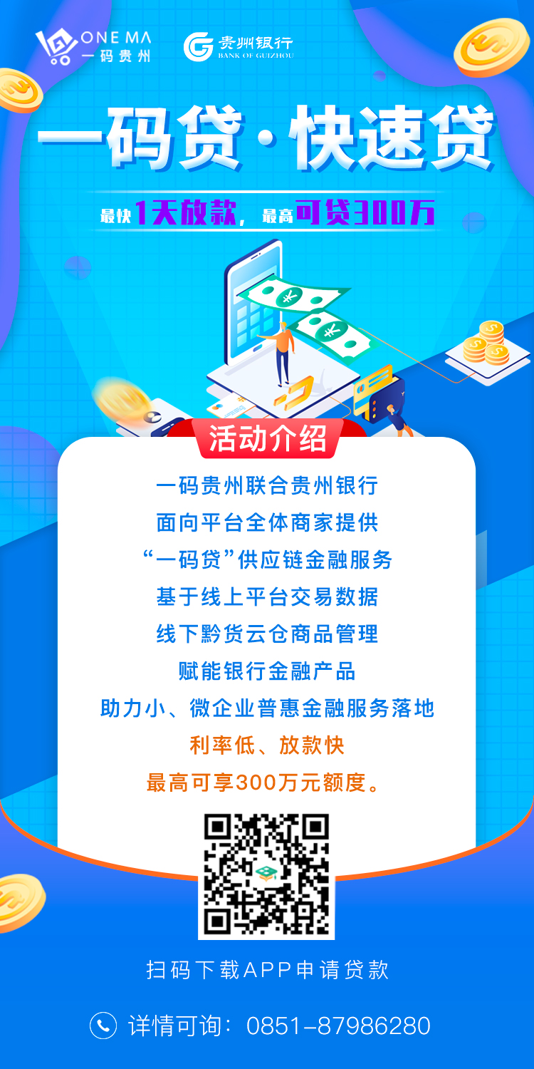 據了解,全新上線的「一碼貸」供應鏈金融服務是貴州銀行在鞏固脫貧攻堅成果期間,為小微企業賦能的全新產品。基於線上平台交易數據和線下黔貨雲倉商品管理,通過對已入駐「一碼貴州」平台商戶進行合理評估與篩選,在充分考量前期經營情況和資金計劃之後,可向企業給與年化利率低至5%,最高授信300萬元額度的融資支持,具有年化利率低、信用額度高、放款速度快的特點。