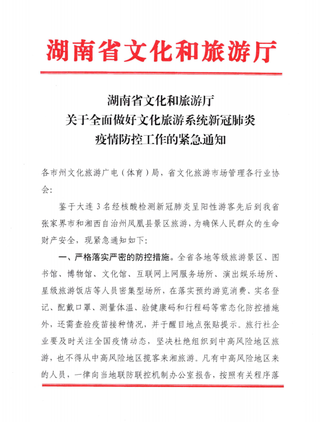 針對日前曾到訪湖南張家界市和湘西自治州鳳凰縣旅遊的三名大連遊客,核酸檢測呈陽性。7月28日,湖南省文化和旅遊廳下發《關於全面做好文化旅遊系統新冠肺炎疫情防控工作的緊急通知》(以下簡稱《通知》)。