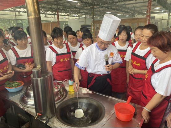 培訓現場,七個柴火灶台一字排開,80多名鄉村婦女分成七個小組圍在灶台前,認真聽著中國徽菜非遺傳承人潘志峰講解徽州農家土菜的做法:如何切肉、怎麼炒糖色、配料是多少,老師講得頭頭是道,學員們也聽的格外仔細。