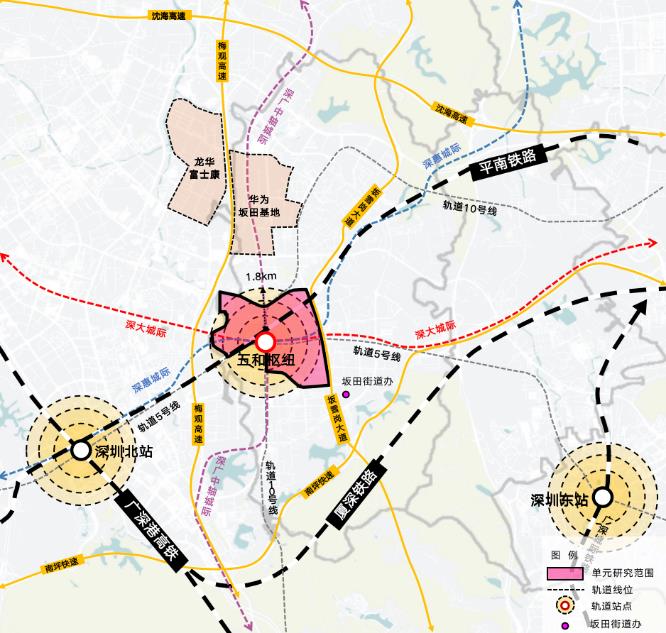 在龍崗“一芯兩核多支點”發展戰略中,五和樞紐片區在未來深圳城市發展中具有重要戰略地位。五和樞紐城市更新專案彙聚了包括兩條地鐵、三條城際在內的五條軌道線,將連通粵港澳大灣區所有核心城市,區域輻射能力極強。五和樞紐作為深圳市客流量第三的交通樞紐(僅次於前海和深圳北樞紐),將成為大灣區核心城際樞紐之一。深圳正式迎來“雙區驅動、雙區疊加”的黃金發展期,五和片區的阪雪崗科技城是廣深港澳科創走廊的關鍵錨點,五和樞紐城市更新專案將推動灣區創新要素高效流動。