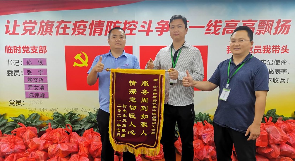 7月31日下午,曾在沙井街道集中隔離酒店蔚徠酒店隔離的江西籍來深建設者柯賢衛,從醫院一出來,就到蔚徠酒店專班組辦公室送去了印有「服務周到如家人;情深意切暖人心」的錦旗,感謝專班組與壆崗社區的真誠關愛,感謝於坤波科長「一對一」的貼心服務,讓他能在酒店安心隔離,如今老婆在醫院順利分娩,現在孩子滿月健健康康出院了。