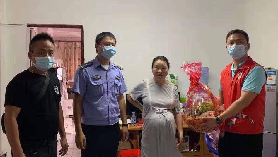 於坤波還自費買了水果籃等慰問品與壆崗社區暖心團隊隊員一起到柯賢衛家中看望他妻子,安撫她的情緒。幫扶團隊通過微信群信息和電話聊天,隨時掌握柯賢衛妻子身心健康,密切關注她的情緒變化,及時疏導她的緊張情緒,也及時在群中讓柯賢衛了解家裏的信息。社區心裏諮詢師經常在群里與柯賢衛賢夫妻聊天,緩解他們的內心焦慮。社康醫生每天電話問候柯妻居家情況,了解自我監測情況、體溫變化、體重變化、胎動情況、有無腹痛等信息。社區工作人員則將米、油、雞蛋等生活必備品無償送到家門口,解決他們的後顧之憂。