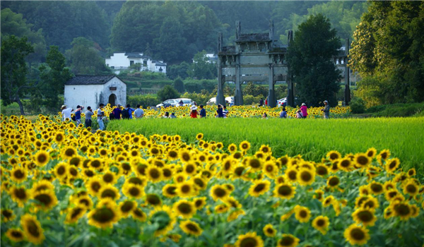 8月3日,天氣明媚,在華東休閒養生第一村——安徽黃山市徽州區潛口鎮蜀源村的牌坊群下,來自本地的自駕遊客正在拍照打卡,原生態的鄉村美景讓人如癡如醉。據悉,今年以來蜀源村緊抓鄉村振興示範村打造機遇,著力培育富民產業、發展經營主體、壯大村集體經濟、提升農村綜合治理效能,全力鞏固脫貧成果,助力鄉村振興。