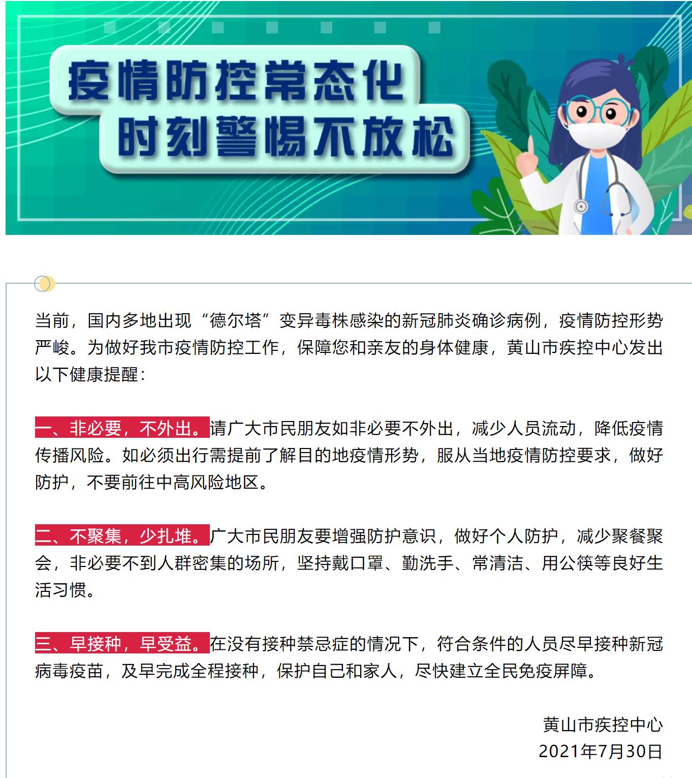 黃山市要求:精細抓好交通場站、酒店民宿、商超市場、建設工地等人員密集場所疫情防控,堅決把各項工作做得細而又細、實而又實;把握“時、度、效”,客觀真實精准做好宣傳,及時準確發佈資訊,引導群眾增強自我防護意識,安全有力有序組織疫苗接種,全面構築健康免疫屏障;把核酸檢測、醫療救治、物資儲備等各項準備工作做充分做扎實,進一步提高應急處置能力。