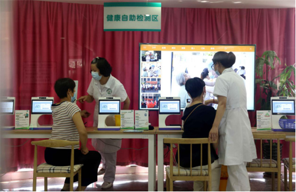 2021年8月3日,在合肥市瑤海區大興鎮社區衛生服務中心的「健康小屋」,社區醫生在指導居民進行自我健康檢測
