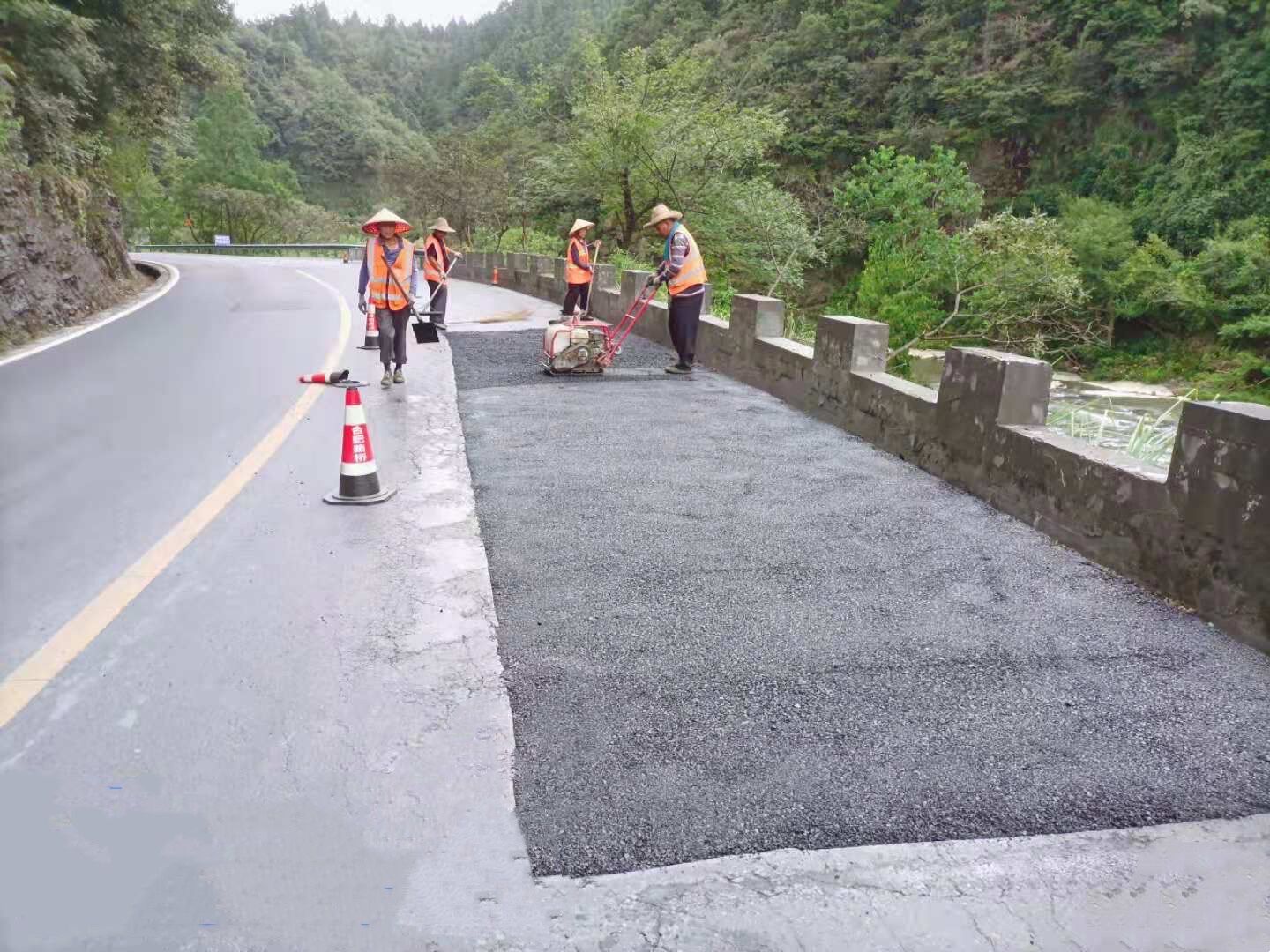 因前期雨水較多,G530線多處路面出現下沉、凹坑。8月份以來,黟縣分中心養護人員巧妙利用高溫有利天氣對G530線K38+460、K44+80、K44+100、K44+550、K45+50處路面下沉或凹坑進行施工。施工過程中,規範設置標誌標牌,開挖路面表層瀝青,再用新的熱拌瀝青重新鋪設路面。據統計,共修補路面100多平方米。