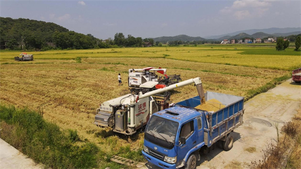 從7月25日開始,每天都有數台收割機在周躍和家的稻田裏來回穿梭,進行搶收作業,同時旋耕機也在抓緊時間翻耕土地,為隨後的晚稻種植做準備,機械化作業使得「雙搶」的效率大大提高。「自從使用機械化作業後,一天可以收割六七十畝,大大提高了效率,節約了時間,人也輕鬆多了。今年氣候條件較好,在種糧政策鼓勵拉動,地方政府引導推動下,早稻種植收割和晚稻種植的時間節點提前了十天左右,這樣產量就更有保障。預計平均畝產在500公斤左右,8月初將全部完成「雙搶」工作。」周躍和告訴記者。