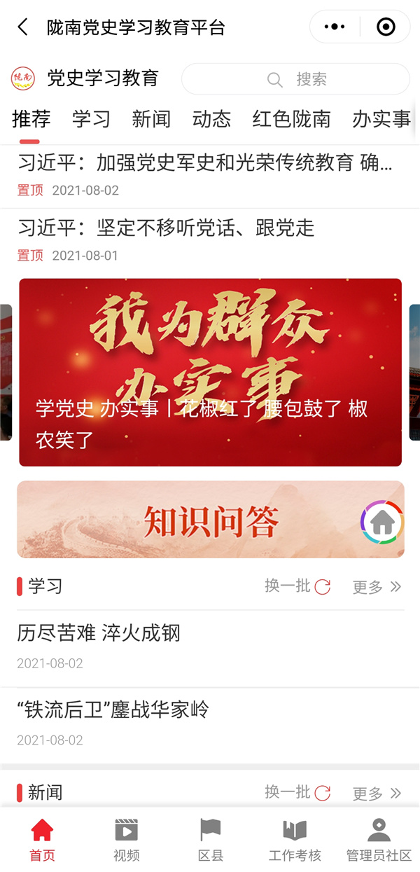 隴南黨史學習教育平台設置9個專欄,設置了「學習」「新聞」「動態」「紅色隴南」「辦實事」等9個專欄,方便全市廣大黨員幹部學習黨史知識、了解學習教育動態、開展互動交流。