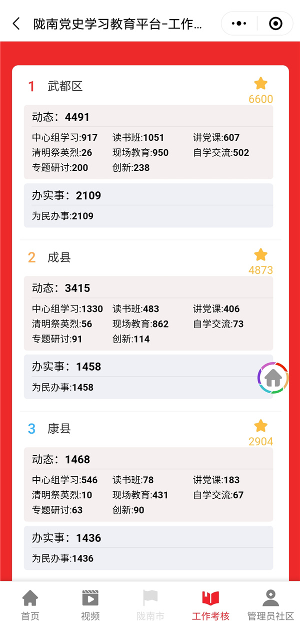 武都區6600、成縣4873……8月2日,在平台的「工作考核」專欄及時反映着各縣區、各單位開展中心組學習、讀書班、講黨課、清明祭英烈、現場教育、自學交流、專題研討、創新、辦實事等活動進展情況。