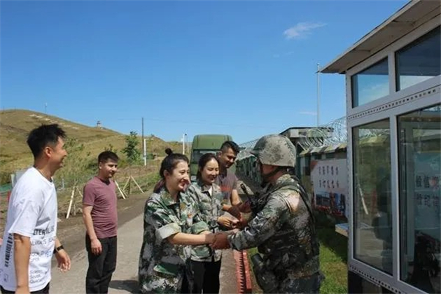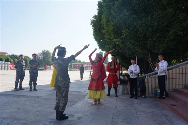在博爾塔拉軍分區的野外駐訓地,「石榴籽」文化小分隊精心編排的歌曲《沿着你的目光前行》、舞蹈《草原隨想》、雜技《手技》等精彩節目輪番上演,駐訓官兵也拿出看家本領與服務隊互動表演,場面十分熱鬧。「石榴籽」文化小分隊還來到「風中第一哨」阿拉山口邊防連,為官兵們帶來精彩的演出,文化小分隊隊員在哨樓上眺望遼闊的國土,青年歌手賈倩倩迎風獻歌一曲《我愛你中國》,送給在哨位上執勤的戰士,感謝他們的無私奉獻。