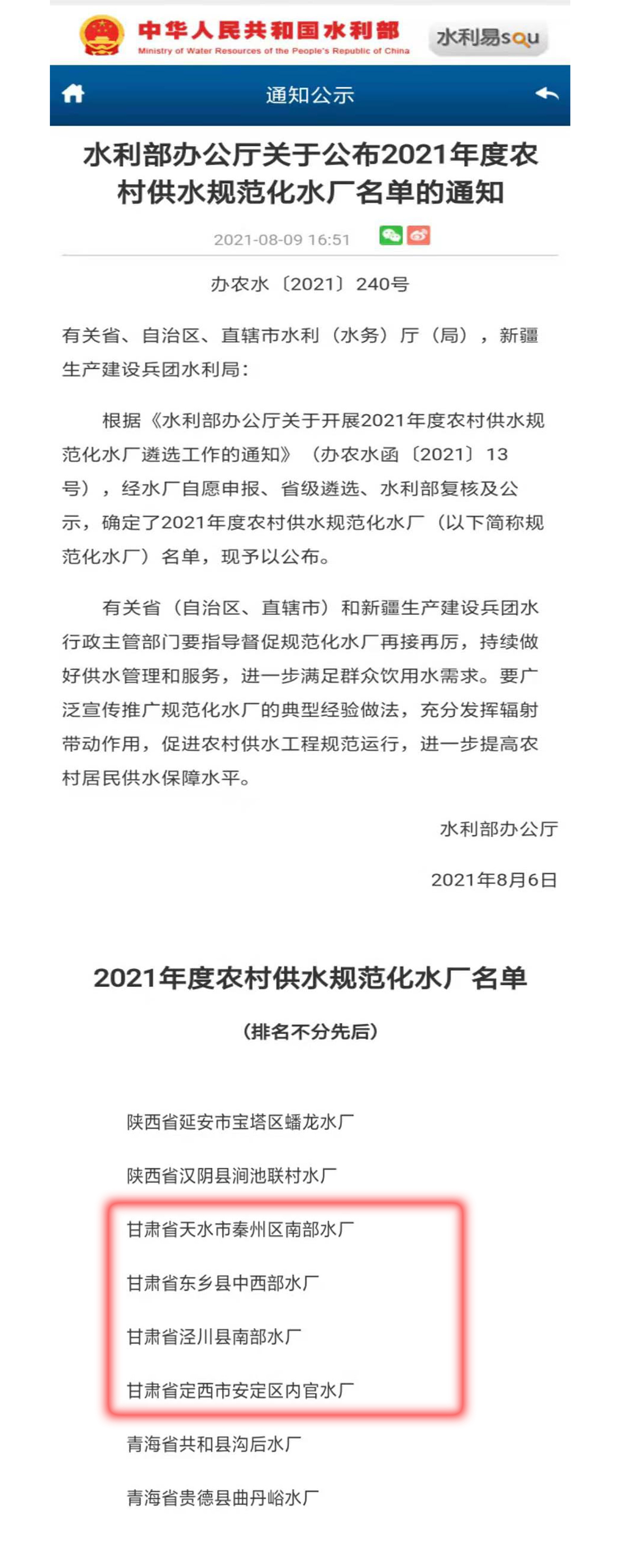 根據《水利部辦公廳關於開展2021年度農村供水規範化水廠遴選工作的通知》,經水廠自願申報、省級遴選、水利部覆核及公示,日前水利部公布了2021年度99個農村供水規範化水廠名單。甘肅省天水市秦州區南部水廠、甘肅省東鄉縣中西部水廠、甘肅省涇川縣南部水廠、甘肅省定西市安定區內官水廠入選。