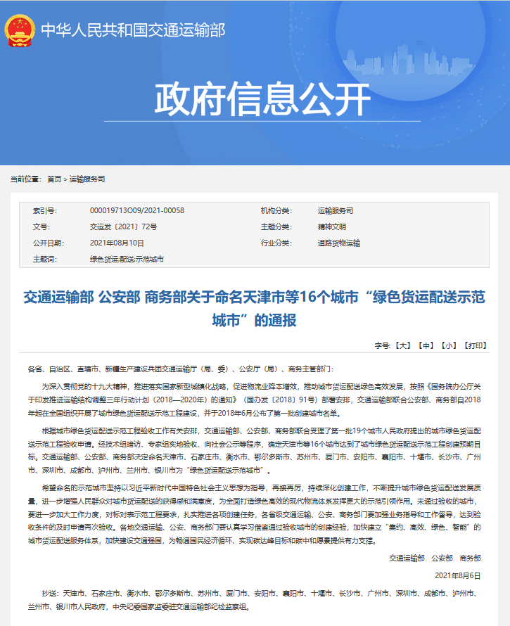日前,交通運輸部、公安部、商務部發布了關於命名天津市等16個城市「綠色貨運配送示範城市」的通報,甘肅省蘭州市在列。