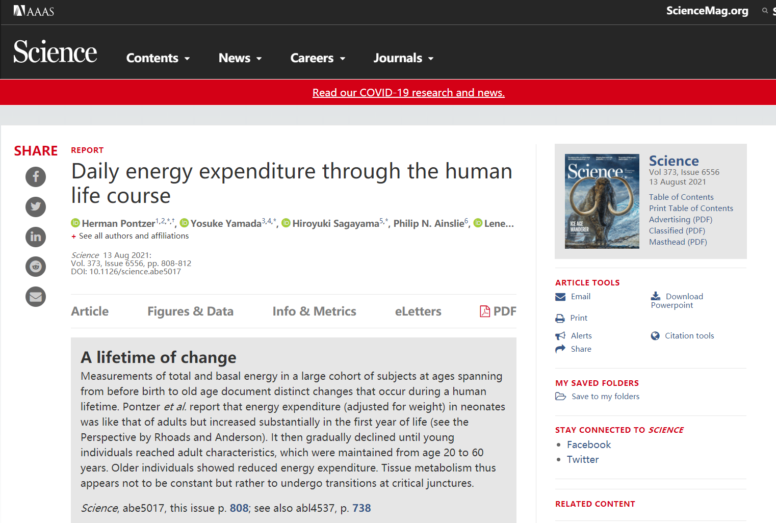 8月13日,中國科學院深圳理工大學(籌)藥學院講席教授、中國科學院深圳先進技術研究院醫藥所能量代謝與生殖研究中心首席科學家約翰·羅傑·斯彼克曼(John Roger Speakman)團隊聯合杜克大學進化人類學副教授赫爾曼·龐澤(Herman Pontzer)等多個國際團隊的最新研究成果發表於《科學》雜誌。該研究通過大規模的國際合作,準確測量了人類從出生到老年的代謝率的高峰和低谷,首次揭示了全生命周期的代謝規律。