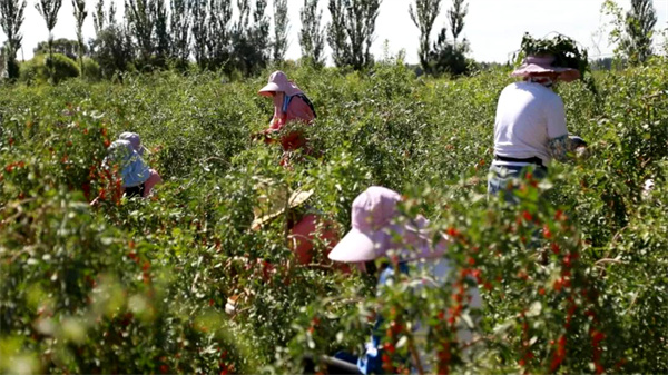 如今正值枸杞採摘旺季,在甘肅省瓜州縣一零農殘枸杞種植基地,工人們正忙着採摘枸杞。