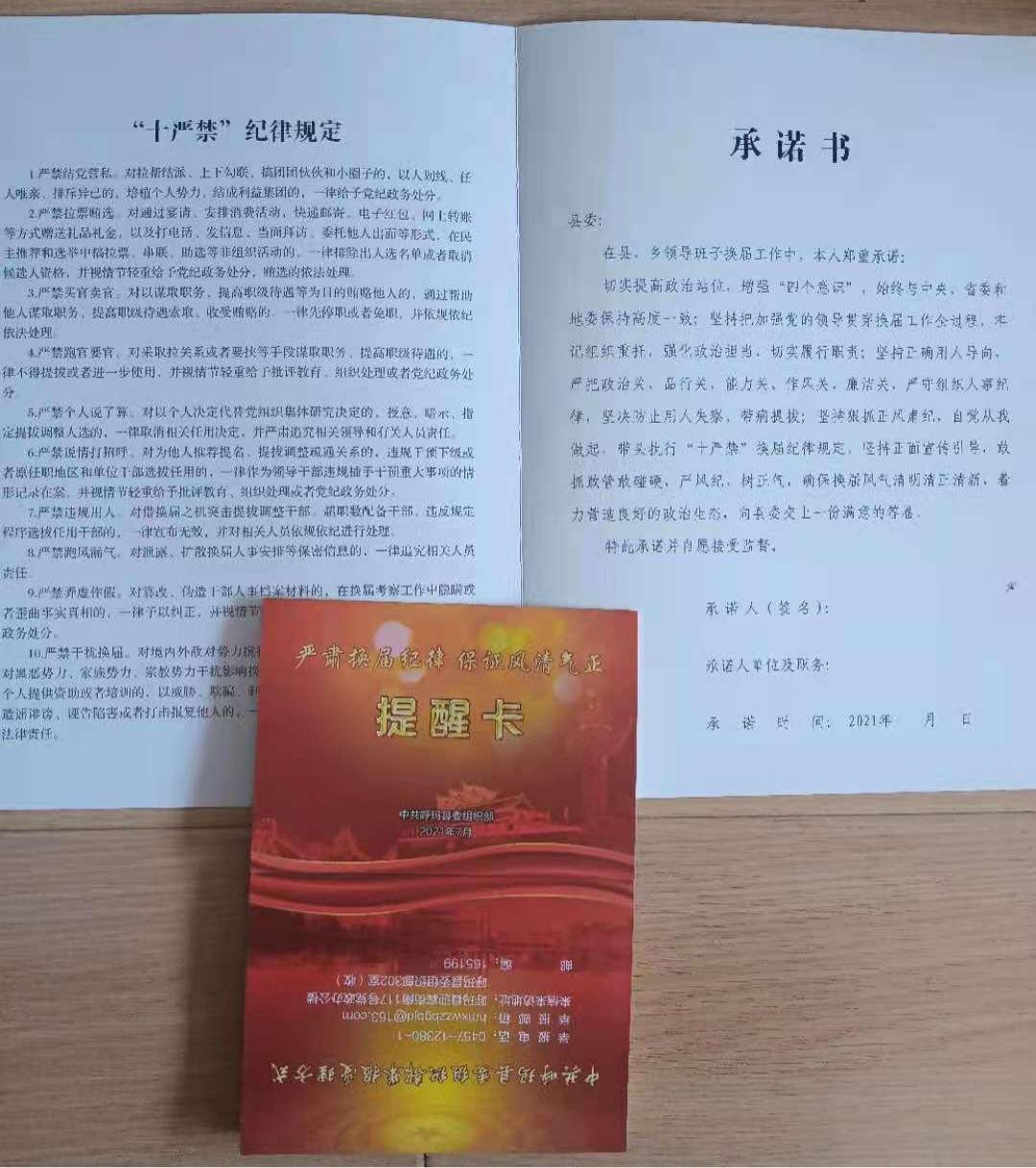 把牢思想教育關。堅持教育在先、警示在先、預防在先,落實「四個必談」要求,牢牢抓住領導幹部這個「關鍵少數」,組織各級黨組織把換屆紀律教育作為中心組學習、專題黨課、黨員活動日、主題黨日、黨史學習教育的「常規課程」,讀懂弄通紀律要求,切實做到知紅線、守底線、不觸線。將思想政治引領貫穿換屆始終,結合黨史學習教育強化換屆紀律教育,發放給全縣處、科級領導幹部及換屆工作相關人員「一卡一信一書一冊一圖」3000餘份,懸掛換屆條幅121個,組織縣鄉幹部集中觀看警示教育片,充分認識換屆紀律的嚴肅性和政治性,增強抵禦不正之風的免疫力。