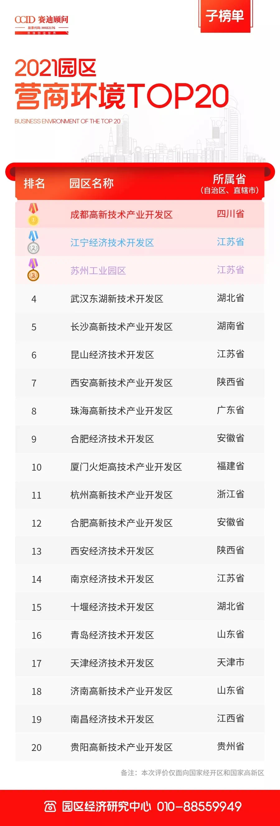 近日「園區高質量發展百強(2021)」榜單由賽迪顧問園區經濟研究中心正式發佈。榜單顯示,四川省上榜3席,其中成都高新區位列第七位。值得一提的是,圍繞「營商引領」單個維度,評價形成了「園區營商環境TOP20」,成都高新區位列營商環境首位。