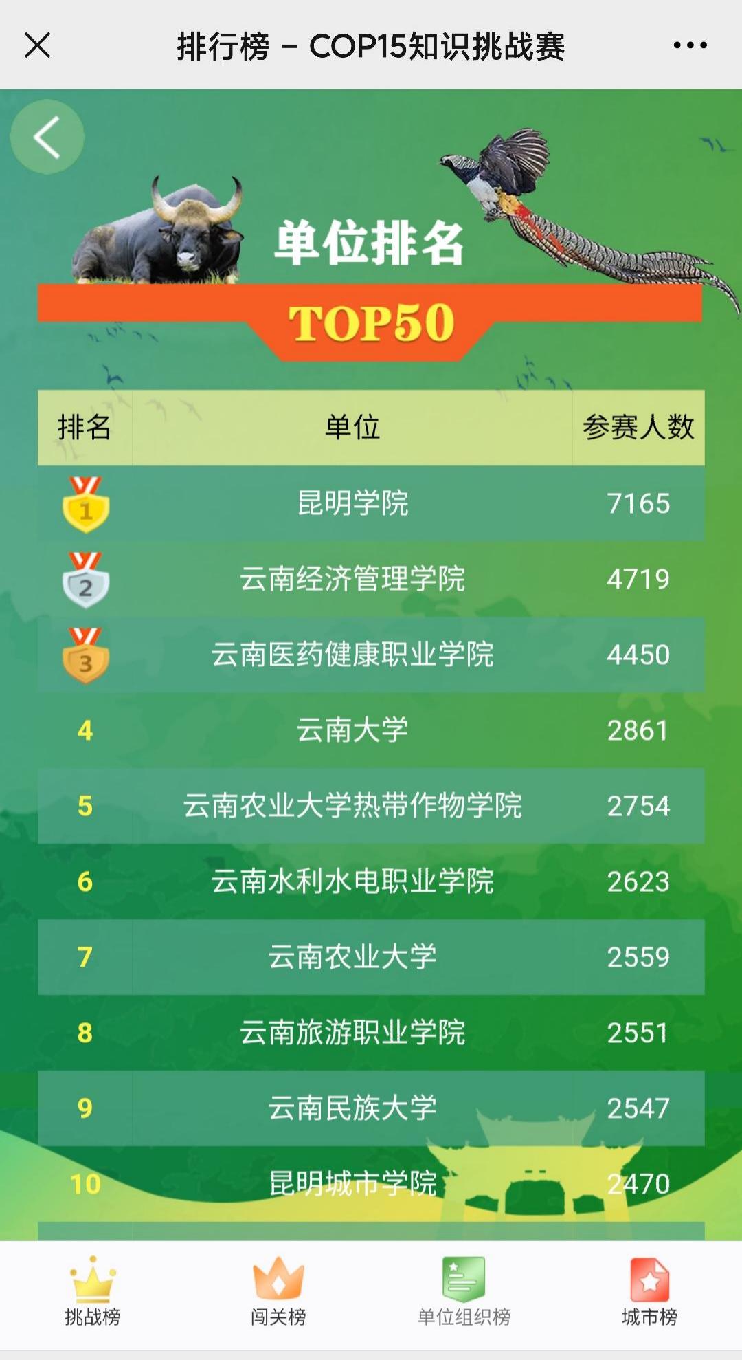 本次比賽也得到眾多單位的積極響應,參與單位達1506個。其中高校參與積極性最高,參與人數超1000人的高校有15所,包括雲南大學、雲南民族大學、雲南農業大學、昆明學院等雲南省內重點院校和雲南醫藥健康職業學院、雲南經濟管理學院、雲南水利水電職業學院、雲南旅遊職業學院等職業技術學院。