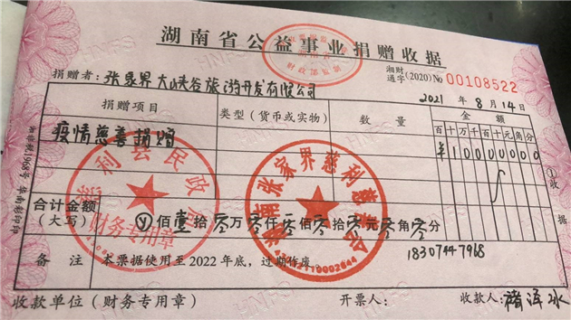 張家界大峽谷景區於2021年8月16日分別向湖南張家界慈利慈善會捐款10萬元、張家界市慈善總會捐款100萬元,支持抗擊新冠疫情。