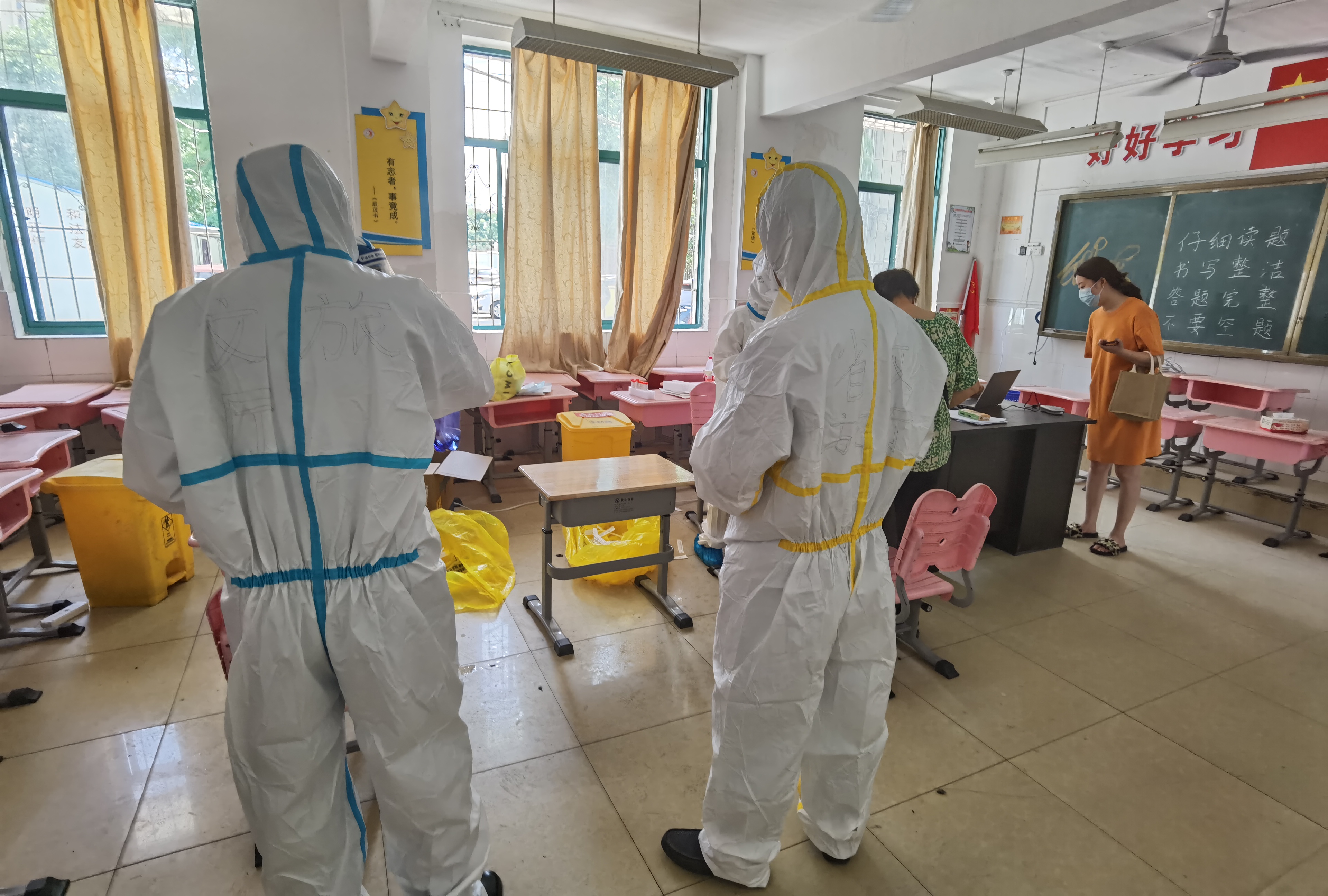 中午1點,新生里社區的新河街學校檢測點,省文旅廳二級巡視員管成文、一級調研員陳同月穿起防護服,50多歲的同志秒變「憨」大白,全副武裝進行室內消殺和協助檢測,適時給檢測的醫務人員噴洒消毒液,協助居民登記身份證、電話號碼等檢測信息,協助有序快速開展核酸檢測。