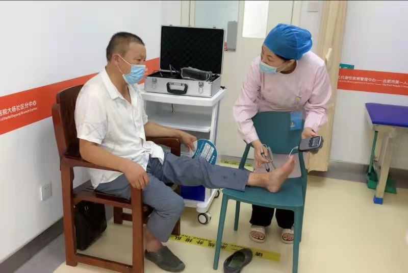 在大楊社區醫院二樓,國家標準化代謝性疾病管理分中心診療室中,合肥市一院“下沉”的護士正在為病人張先生進行糖尿病足篩查,他得知當天上午專家坐診,特地趕來檢查,“大醫院掛號難,現在社區醫院有專家,有先進的醫療設備,我們村民平時生個病在家門口看病既方便也放心。”(秦炳煜 余苗苗 何曉珺)