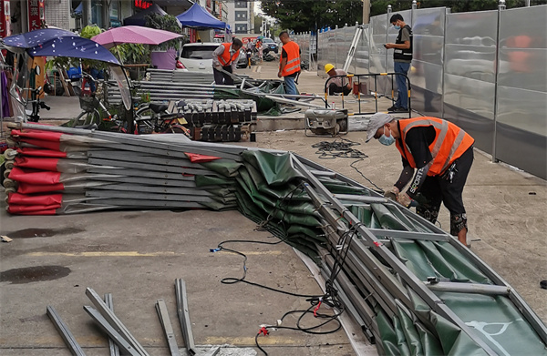 執法人員、整治隊員向沿街商戶耐心解釋相關規定要求,提醒他們自覺遵守相關法律法規,引導他們自覺糾正相關違法行為。商家認識到超門線經營、亂搭建雨棚對市容環境秩序產生的不良影響以及存在的安全隱患,主動配合開展整改工作,並要求將拆除的雨棚鋸成小段,方便他們後續將其進行搬運售賣。