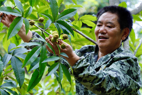 8月27日,在安徽省黃山市歙縣金川鄉,村民洪玉志在查看山核桃果實成熟情況。據瞭解,在郵儲銀行黃山市分行的幫扶下,村民洪玉志的山核桃種植基地由最開始的7畝逐步擴充至52畝,年產量提高至約40000斤,年收入達16萬元。