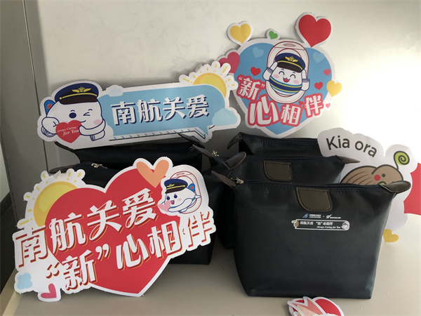 當天的CZ306航班客艙佈置得簡潔溫馨,前面貼有「南航關愛 『新』心相伴」等裝飾,讓所有旅客步入客艙後就感到耳目一新。客艙廣播也有別樣安排:「南航攜手新西蘭貿易發展局特意為新西蘭來華旅客準備了防疫包,在酒店隔離期間也為您提供精心呵護……隔離不隔愛,南航用心守護您的每一次旅途。」防疫包內將提供新西蘭當地各類特色產品,包括口罩、牙具、奶粉、蜂蜜糖、洗衣液、消毒液、手賬本、化妝包等。據悉,首批防疫包將在南航奧克蘭—廣州航線投放,在中秋節這一中國傳統節日時也會在南航新加坡—廣州航班投放。根據實際情況,後續在國慶、元旦、春節等重大節假日,防疫包還將擴大投放到其它南航國際航線。該項目將使10000名國際來華旅客感受到合作雙方的用心關愛和精心安排。