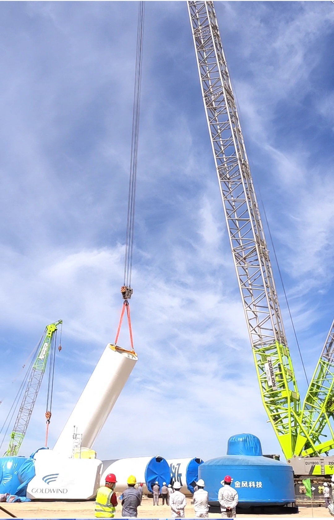 26日,甘肅酒泉泰源新能源有限公司瓜州北大橋第六風電場D區200MW項目4.0兆瓦機組開始全面吊裝。800噸的巨型履帶吊車揮舞着110米的長臂,開始在剛剛組裝的塔筒上懸掛風機葉片。