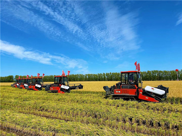 風吹稻田千層浪,生態江川喜開鐮。8月29日上午,黑龍江省江川農場有限公司舉辦第五屆水稻開鐮儀式暨「學黨史、慶豐收」主題實踐活動,金燦燦的水稻在8台自走式割曬機的轟鳴聲中,述說着秋收的喜歡。江川農場第一管理區水稻收割「第一鐮」,標誌着北大荒水稻開始陸續進入收割期。活動現場,江川農場還與廈門國貿集團和墾豐水稻科技有限公司分別簽訂了7.3萬噸、1.9億元優質稻米銷售合同和15萬畝高端優質米種植基地框架協議,喜結「糧緣」碩果豐。