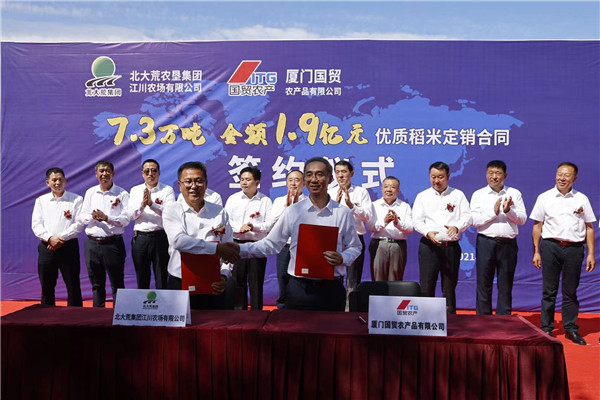 江川農場有限公司黨委副書記、總經理鄢建賓表示,江川農場精心打造稻米產業鏈,公司生產的江川食味米具有地理、品種、品牌、品鑑、佈局五大優勢,食味值達87.3分,是黑龍江唯一一款食味米產品。同時,江川農場依託毗鄰松花江豐富的水資源優勢,陸續引進了水蛭、小龍蝦、河蟹等特色水產養殖項目。2021年訂單種植總面積達12.6萬畝。