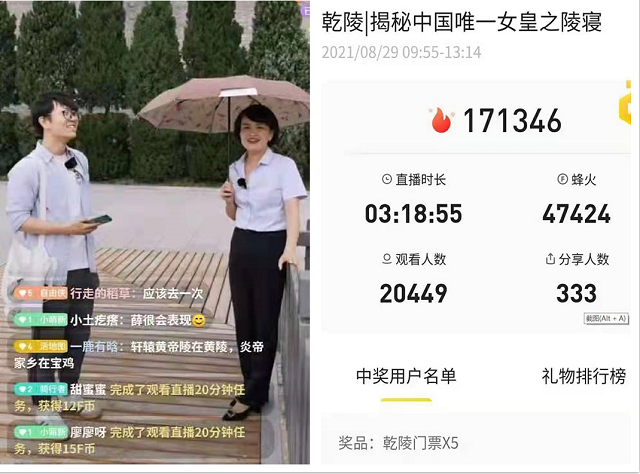 「雲遊絲綢之路」線上互動直播活動29日走進乾陵,通過主播和資深講解員幽默、風趣、專業的解讀,帶着大家穿越千年絲路,感受大唐盛世,品味中華文化,引發觀眾一致好評,直播熱度高達17.1萬。