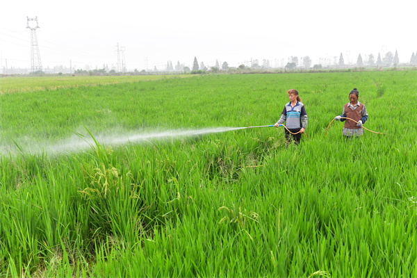 9月2日清早,秋風微拂,稻田裡低垂的稻穗隨風輕輕搖曳。在安徽省巢湖市中垾鎮後咀村大圩,一大早,宏揚家庭農場負責人羅雙牛組織七八名村民為即將抽穗的水稻開展稻曲病防治。