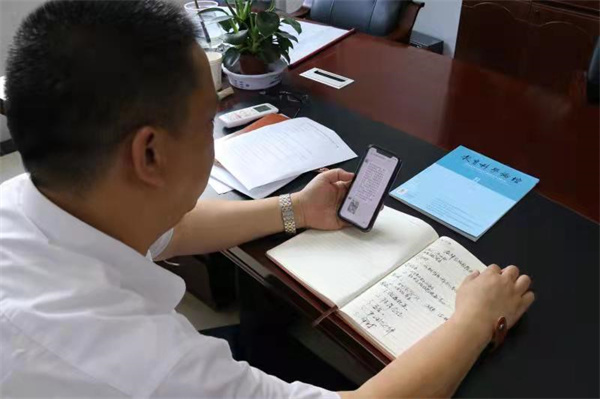 岐伯實驗小學校長任紅艷查看教師節廉潔提醒短訊 花明月 攝