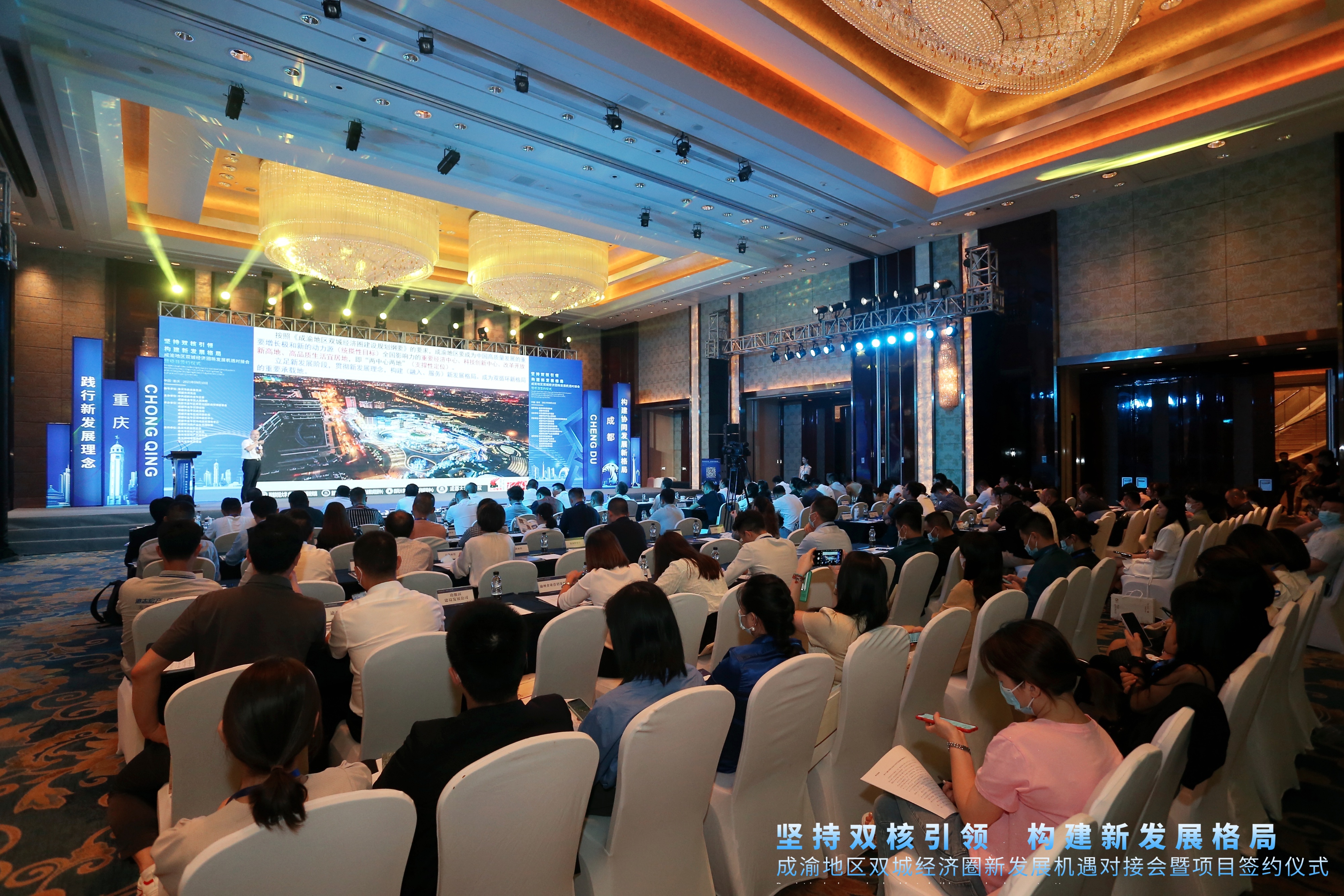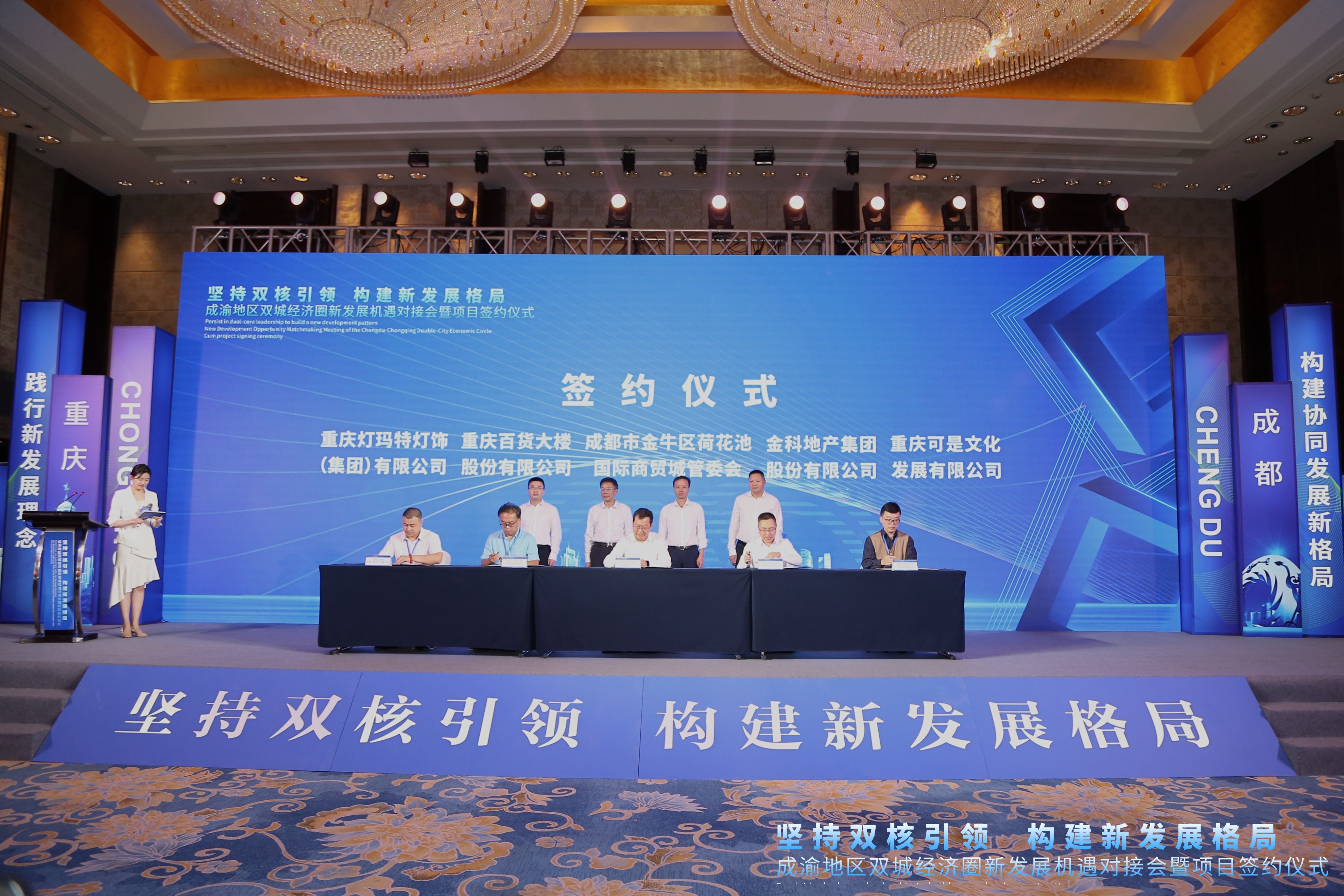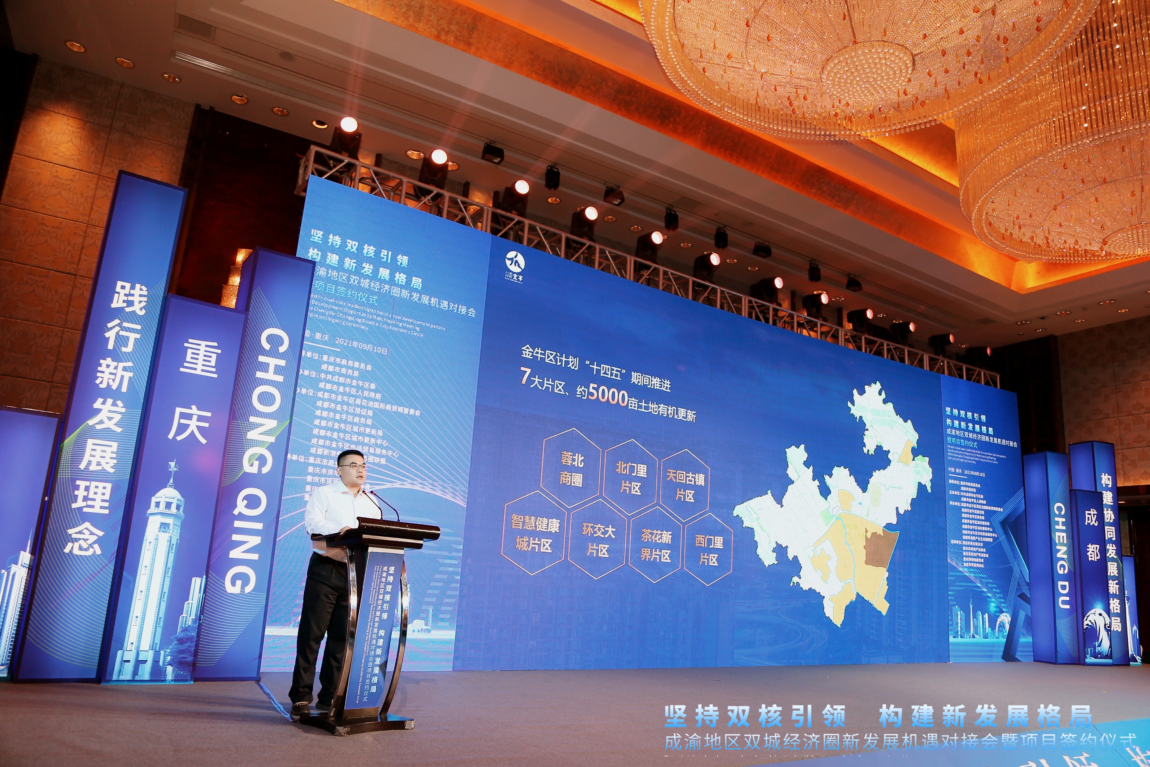 9月10日,以「堅持雙核引領構建新發展格局」為主題的成渝地區雙城經濟圈新發展機遇對接會暨項目簽約儀式在重慶舉行。是次活動由重慶市商務委員會、成都市商務局指導,成都市金牛區委、成都市金牛區人民政府主辦,金牛區荷花池國際商貿城管委會、金牛區投促局、金牛區商務局、金牛區城市更新局、金牛區城市更新中心、金牛區市場貿易服務中心、成都新消費產業生態圈聯盟承辦。