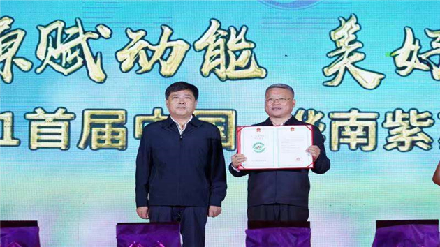 黑龍江省農業農村廳黨組成員、副廳長王學斌向樺南縣委副書記、縣長楊宏志授予 「道地藥材紫蘇生產基地」