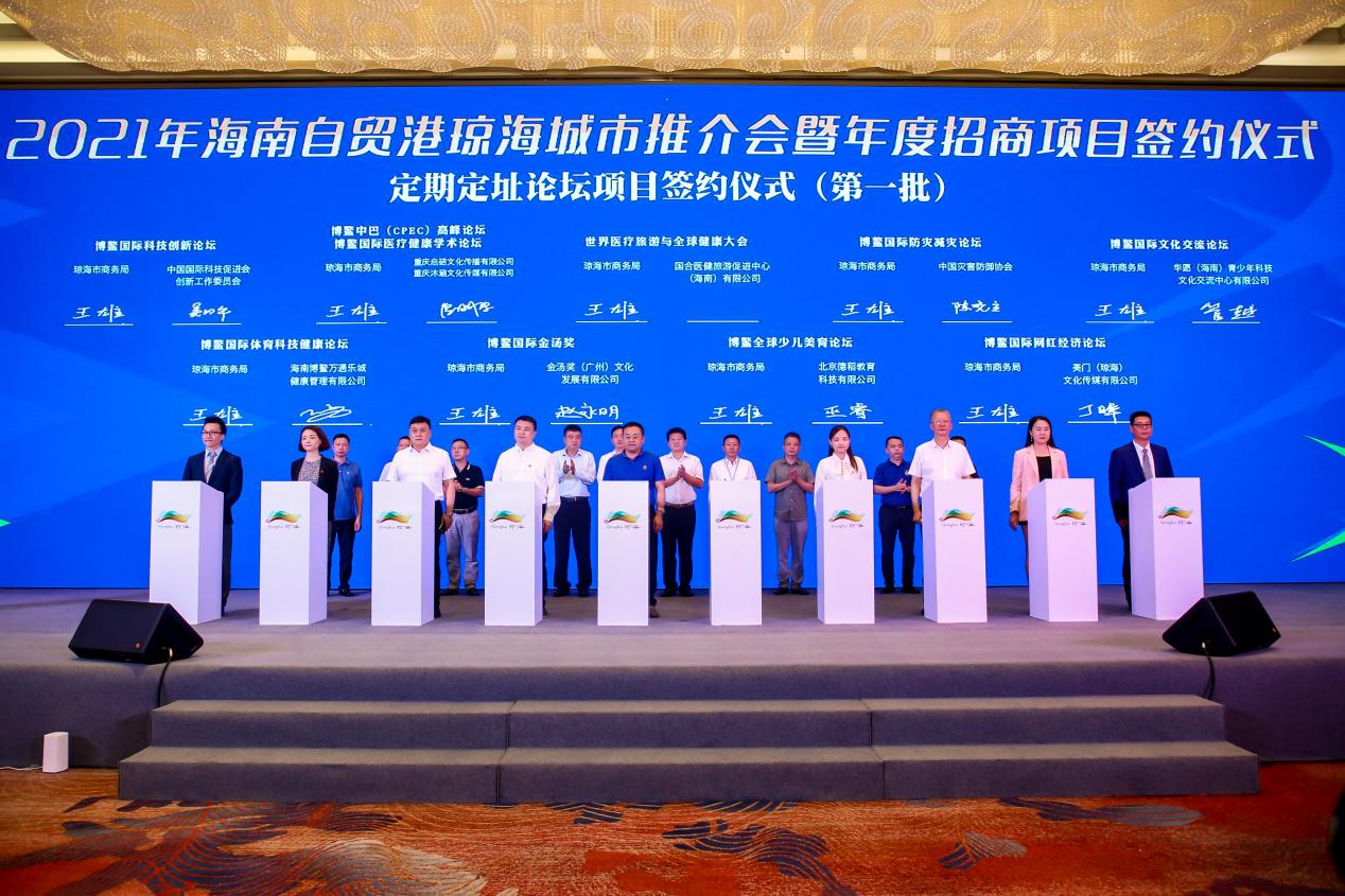 推介會上舉行了瓊海年度招商項目簽約儀式,共簽約項目43個,簽約金額約5.86億元。其中,博鰲定期定址品牌論壇效應凸顯,43個簽約項目中,定期定址論壇項目39個,簽約額3.3億元,佔比高達56.31%;招商項目質量較高,項目涵蓋旅遊業、現代服務業、高新技術產業,包括高端旅遊配套、高端人才培養、數字貿易等項目。本次簽約的項目發展前景好,符合瓊海產業定位和發展需要,將為海南自貿港和瓊海的建設和發展注入新的活力。