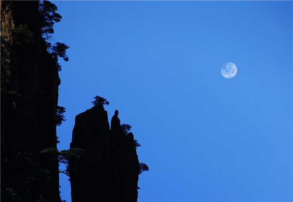 秋天的黃山,漫山紅遍、層林盡染。當夜幕降臨,皎潔明月從山峰間冉冉升起,高懸在黃山夜空,月亮四周伴有祥雲襯托,顯得格外迷人。黃山因空氣純淨清新,有很好的能見度,且海拔高,視野開闊,月亮比在山下看上去顯得更大更圓。