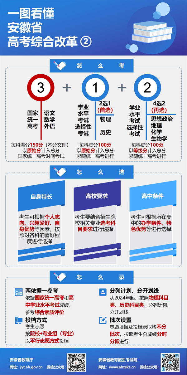 日前,經報教育部備案,安徽省人民政府印發了《安徽省深化普通高校考試招生綜合改革實施方案》(以下簡稱《實施方案》),該省從2021年秋季入學的高一學生開始,實施高考綜合改革。不分文理科,使用全國卷,實行「3+1+2」模式。