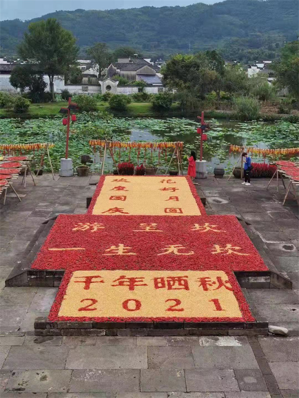第四個中國農民豐收節前夕,在皖南千年古村呈坎村的晾曬場上,村民將收穫歸倉的玉米、黃豆、稻穀南瓜和紅辣椒等果實拼出「花好月圓、歡度國慶」字樣,以農家特有方式向表達對鄉村振興美好生活的嚮往。