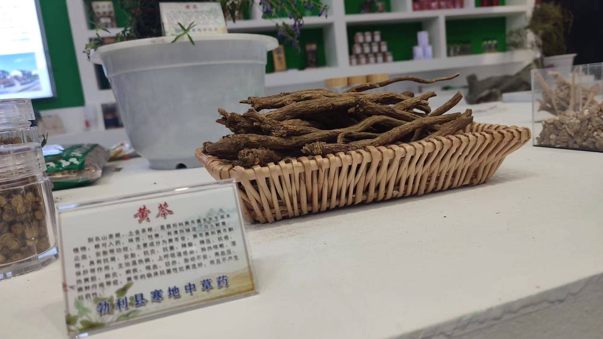 開幕式當天記者走進勃利縣展位,一盆新鮮「帶土移植」的黃芩,花、葉、莖、根完美的展現並擺放在展位中央。通透綠色系的展位,「勃利縣寒地中草藥」「北有勃利,南有亳州」等標語醒目亮相。