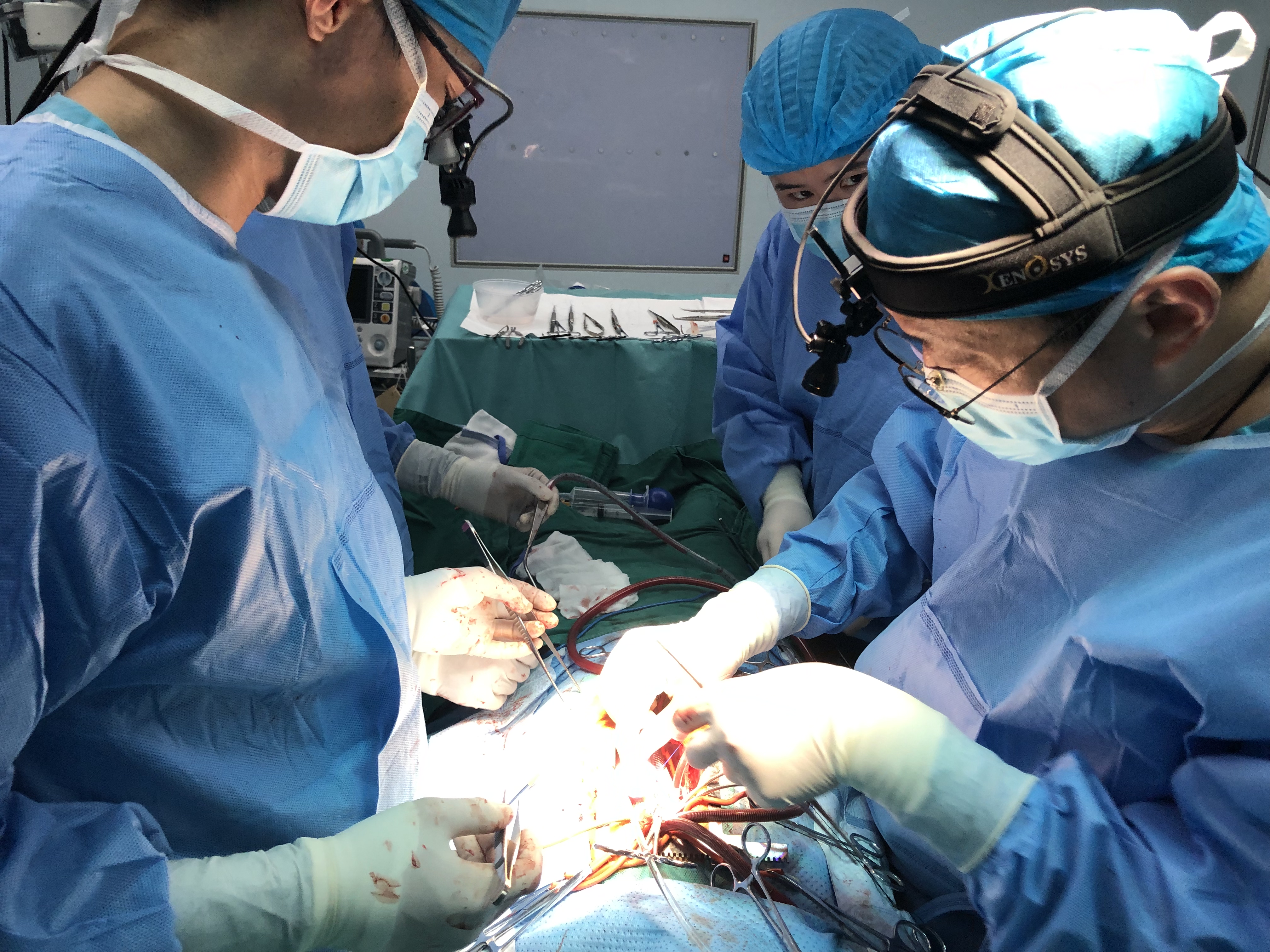 經過精心準備後,手術開始。根據術前分工,陳欣欣主任小心地打開孩子的胸腔,仔細分離粘連組織,終於安全地暴露出心臟及大血管,明確各種解剖結構。另一邊,王鵬程醫生也快馬加鞭地製作肺動脈帶瓣管道。就在肺動脈根部處理快要完成時,手工縫製的肺動脈帶瓣管道也做好了。兩組人馬無縫對接,順利將帶瓣人工肺動脈管道縫合在原肺動脈位置。