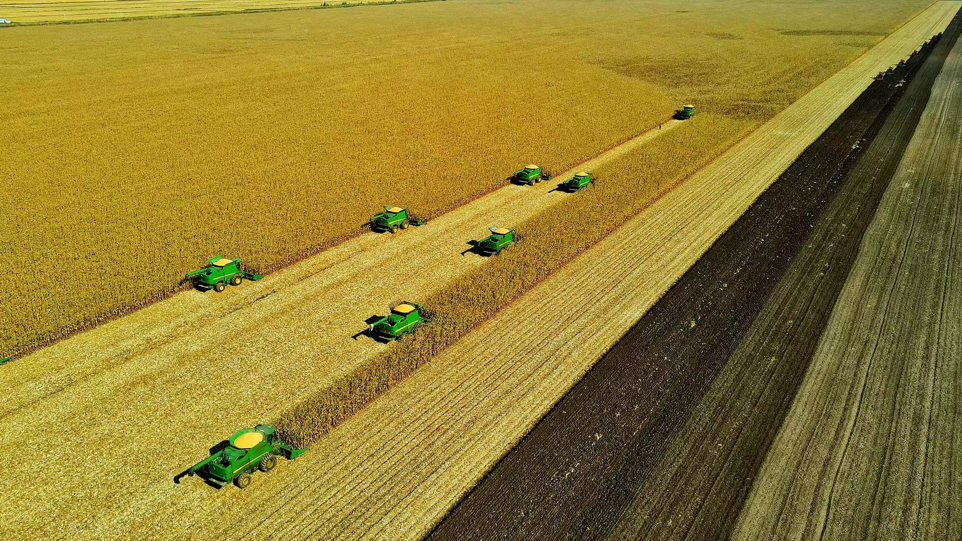 17日清晨8點17分, 中國農民豐收農墾「慶豐收、頌黨恩、啟新程」慶豐收巡禮正式開始。「雁陣」收穫機在玉米和水稻田中馳騁,三台大型植保飛機和小型無人機群在上空穿越和盤旋,勾畫出壯美的豐收圖景。「北大荒用了65年的開墾,實現了『中國大糧倉』『亞洲大糧倉』,用中國四十五分之一的耕地提供了1.4人的口糧。現在糧食產能已穩穩地超過430億斤,了不起呀!」劉成果興奮地說。
