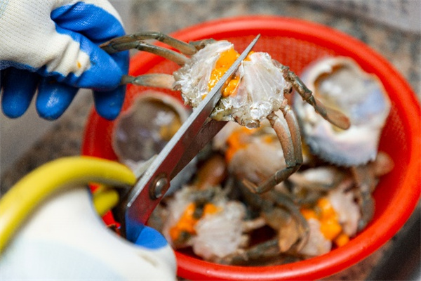 整個廚房乾淨明亮。「毛巾按照功能進行分類及使用,調料盒擺放整齊,所有食材儲存都標註保質日期,避免過期使用。此外,「胖哥倆「每日會對供應商配送的新鮮活蟹進行挑選,在預估當天客流前提下,提前做好宰殺切塊準備。每日營業結束後,對於當天沒有消耗掉的螃蟹,胖哥倆會將死蟹及已被切塊的螃蟹做廢棄處理。「店負責人介紹。