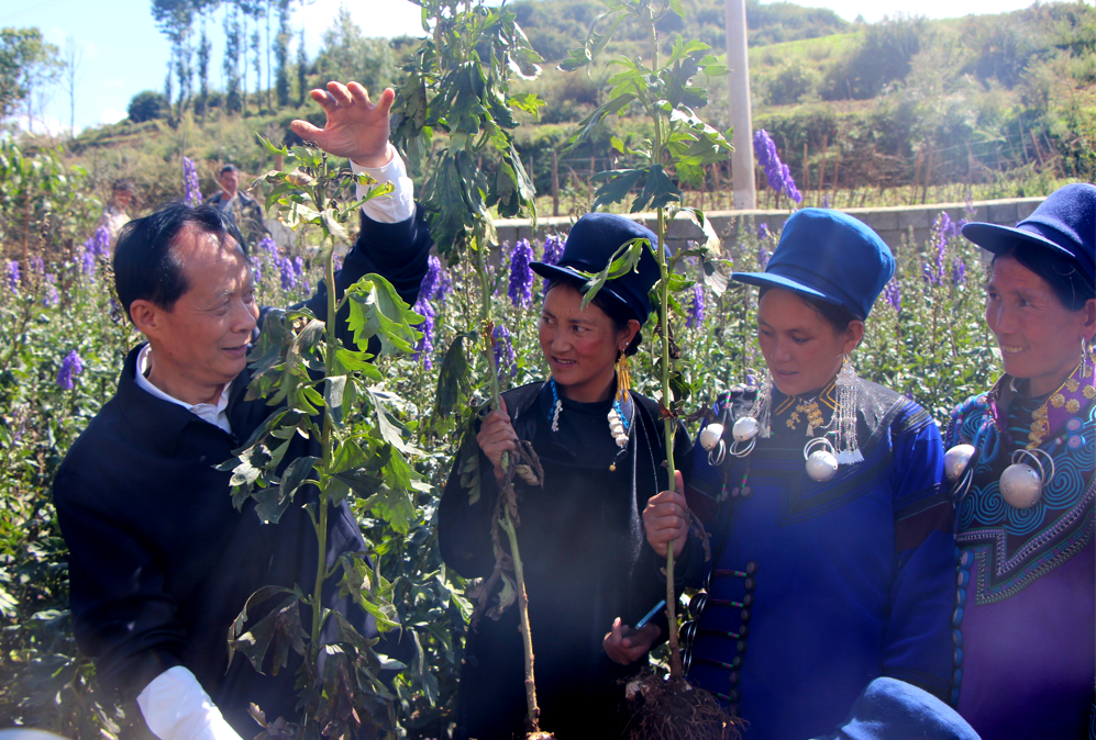 全國人大代表、四川省工商聯副主席、好醫生集團董事長耿福能向火燈村村民傳授附子種植經驗