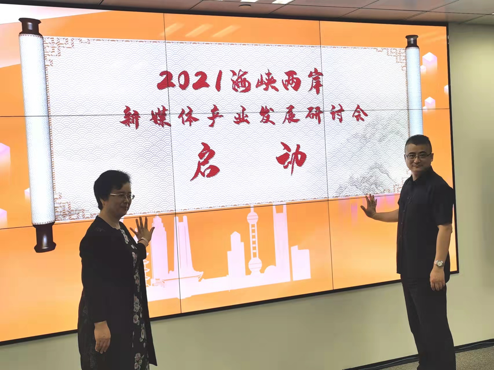 劉燮、李驍東共同啟動「2021海峽兩岸新媒體產業發展研討會」。活動由靜安區台辦主任王立萍和台塑企業總管理處顧問施明黎在上海和台北雙會場共同主持。