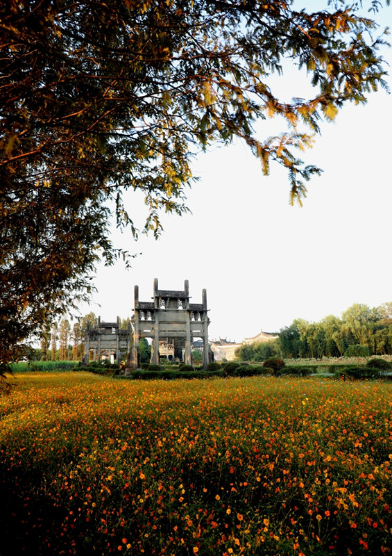 9月24日,安徽歙縣棠樾村牌坊群邊上的“格桑花”盛開,金色黃花為山村秋景增色。