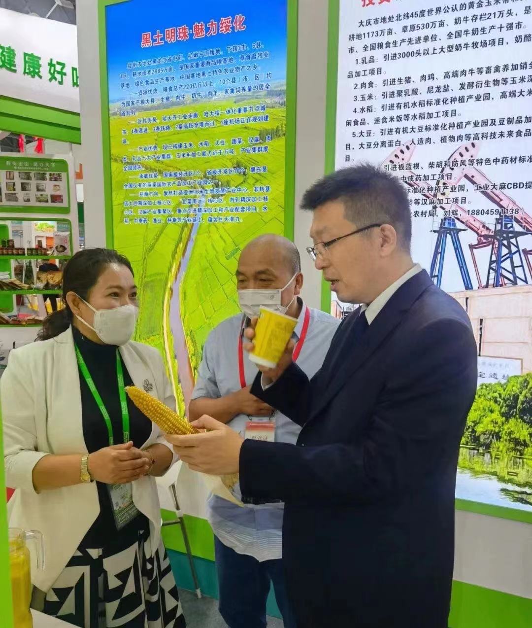 農業農村部鄉村產業發展司副司長周業錚巡展時,來到黑龍江省展區哈爾濱健康農牧業展位前駐足品嘗小園玉米汁,對其連連稱讚。