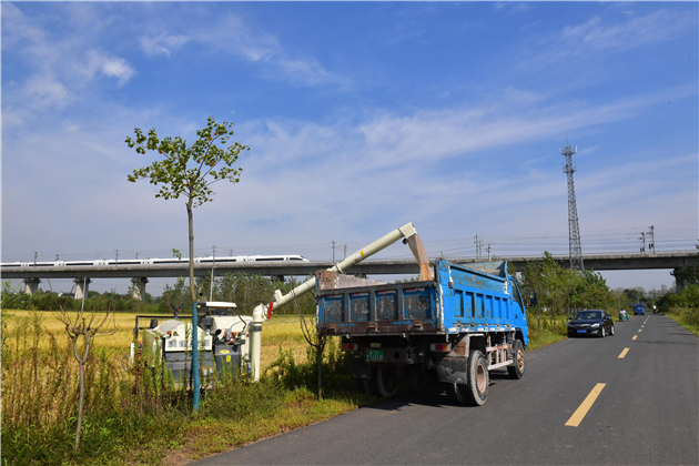 示範田裡,伴隨着「隆隆」響聲,兩台水稻收割機開足馬力正穿梭在稻田裡,一茬茬水稻源源不斷地被捲入收割機,經過脫粒處理後的稻穀全部收攏在收割機的「肚」里,秸稈進行粉碎處理,從收割機尾部吹散到稻田裡。幾十分鐘後,一塊稻田便完成了割稻,稻穀隨後被卸載到路邊的貨車裡,卸完稻穀的收割機再次回到田裡繼續「奮戰」,一派忙碌的豐收景象。